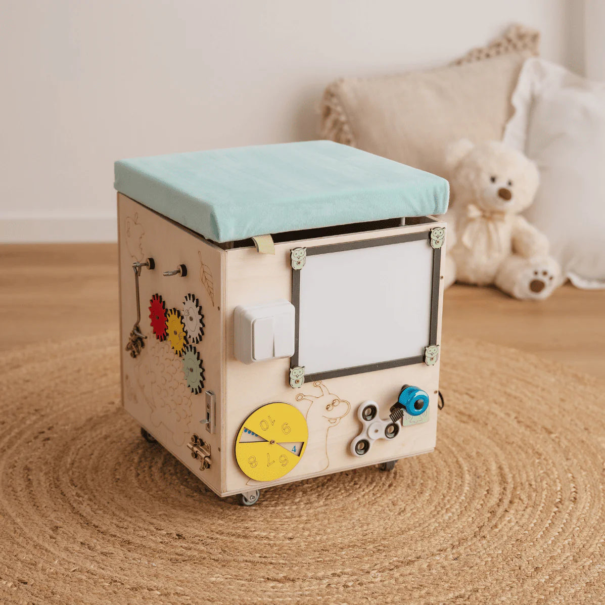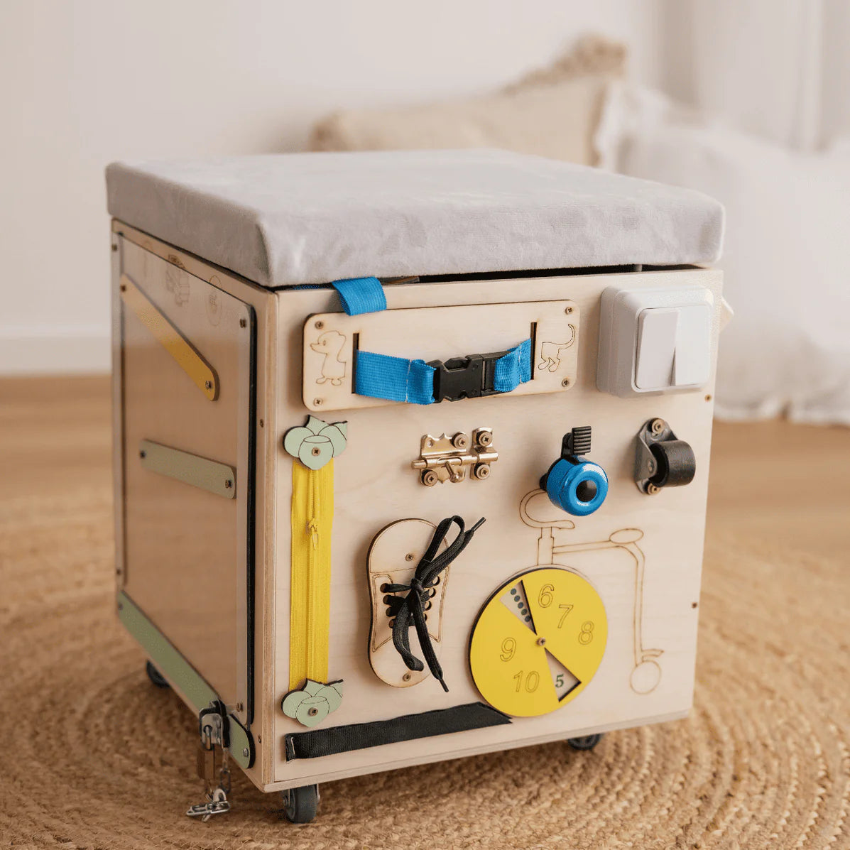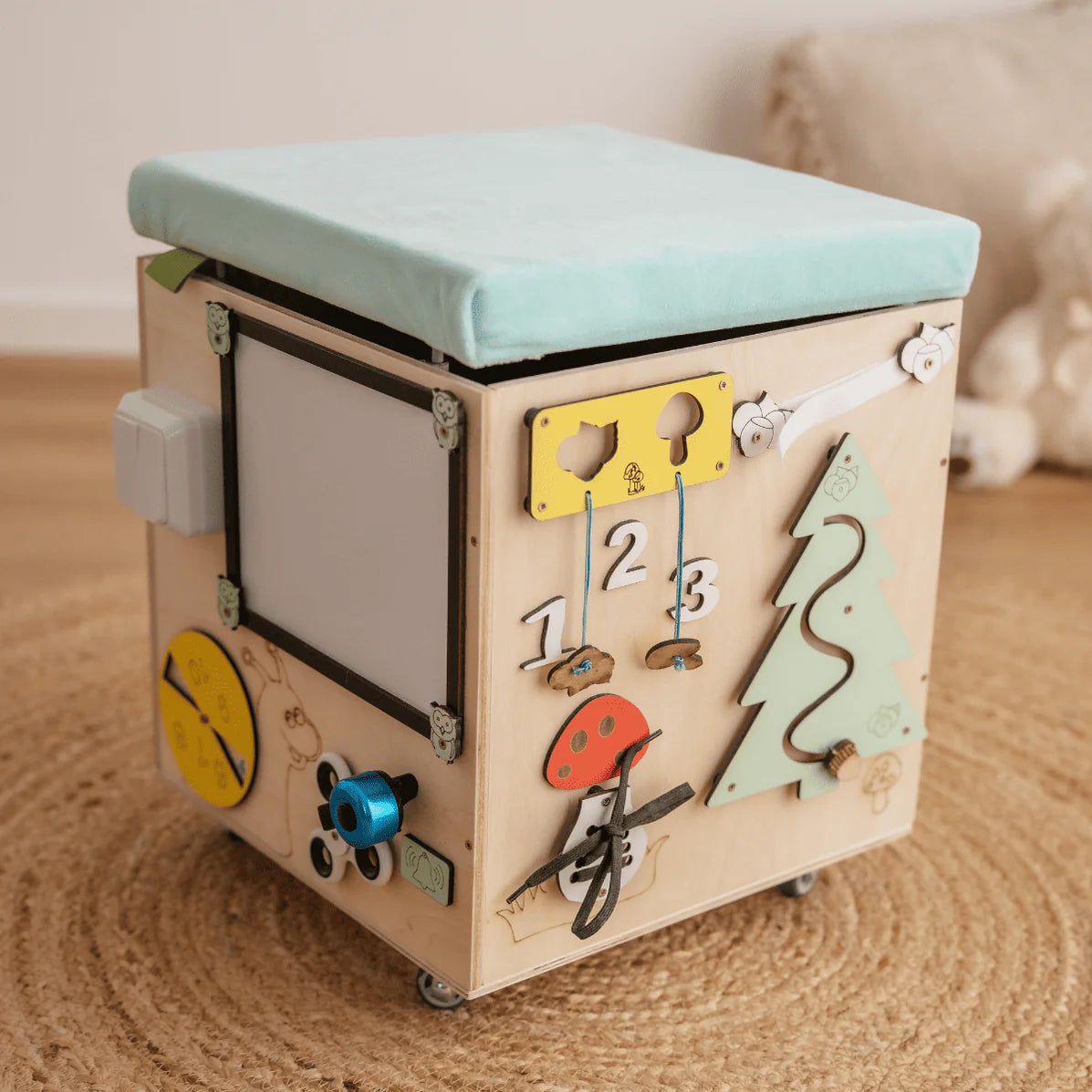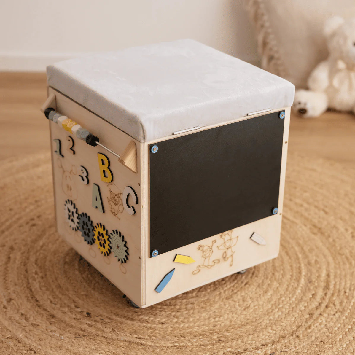 Die Montessori Multi-Aktivitäts-Truhe ist eine vielseitige Kombination aus pädagogischem Spielzeug und praktischer Aufbewahrung. Sie bietet sensorische Aktivitäten, motorische Übungen und gleichzeitig eine bequeme, gepolsterte Sitzfläche sowie einen großen Stauraum für Spielzeug.